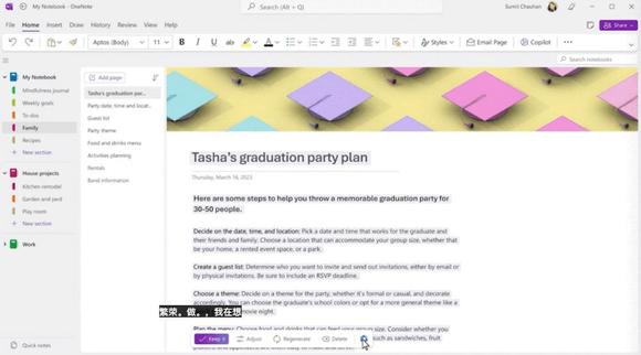 接下来,为派对做具体计划,Copilot也能帮得上忙。它可以为派对所需考虑的所有事情创建页面。输入“帮我给Tasha大约有30~50人的高中毕业派对创建一个计划”,Copilot就能高效完成任务。