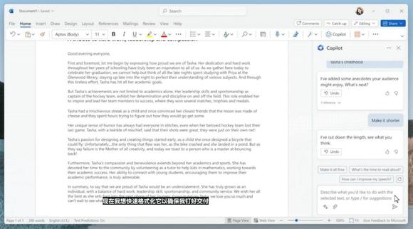 Copilot还可以自动调整间距,让阅读更舒适。用户也可以向它征询关于所选文字内容的优化建议。