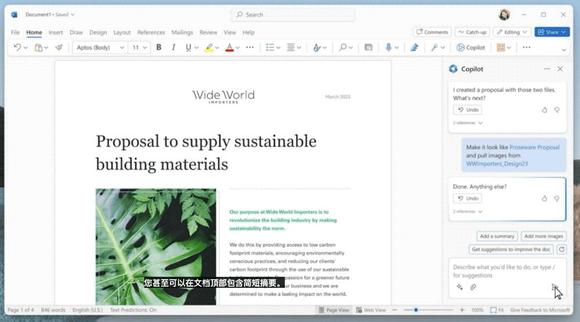 在页面右方,点击“添加摘要”,Copilot就会在文档顶部生成简短的摘要。同样,也可以要求它提供一些建议来优化客户提案。