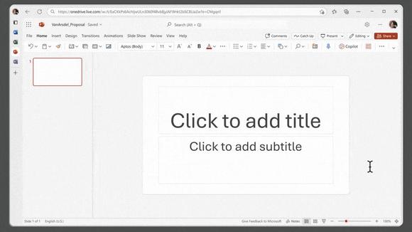 下一步,将客户提案变成可向客户演示的PPT。只要在PPT的Copilot文本框中输入“创建一个基于「VanArsdel Proposal」文件的presentation”,它立刻生成一份5页、演讲时长约10分钟的PPT。