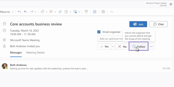 在会议列表,除了“接受”和“拒绝”,Teams还提供了“Follow”选项。也就是说,即便你本人没有在线下或线上实时跟进这一次会议,也可以达到与上述方式类似的参会效果。