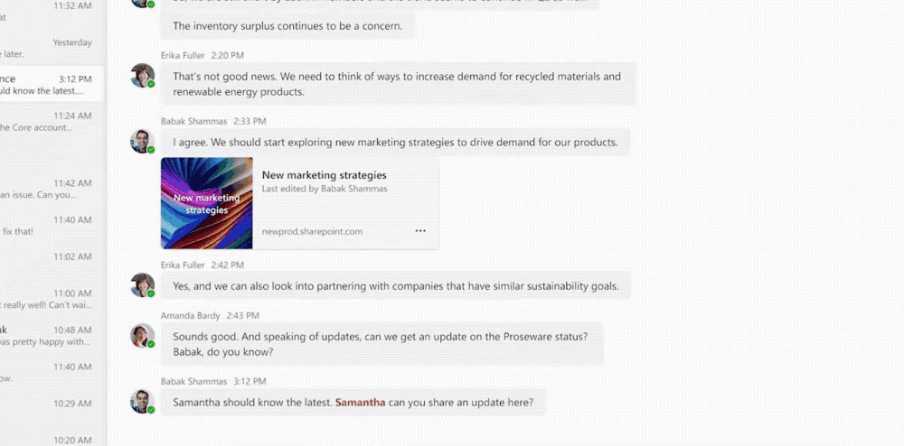 比如,当你问“昨天Fabrikam做了啥”,它会立刻总结出跟Fabrikam相关的进展,并附上相关文件。当你把鼠标悬停在人名或文件名上,会出现更多详细信息。