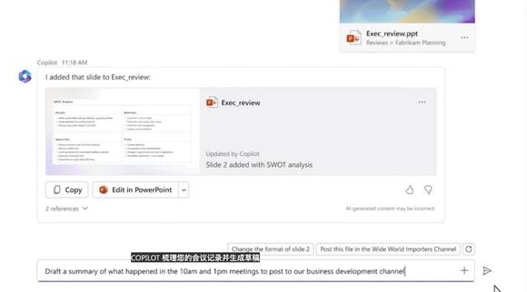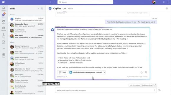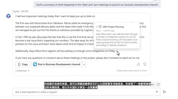 除了在线上实时“Follow”关注会议进展,收到其他团队成员的共享文档、与客户讨论、通知等,你还可以随时“提问”。例如当看到同事就某个问题做出决定时,你可以询问“为什么会做出这个决定”“还有哪些考虑选项”等,得到Copilot的回答时,它还会为引用相关信息作为补充说明,减少进一步的沟通成本。