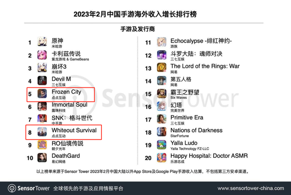 今年2月份,点点互动旗下一轻一重的两款末日新游《Frozen City》和《Whiteout Survival》双双跻身进入2月中国手游海外收入增长榜TOP10,成功实现了“一鱼两吃”。