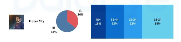 据《SLG品类增长白皮书(2022版)》,《Whiteout Survival》所在的SLG赛道中,男性用户占比高达88%,女性占比仅有12%,且玩家年龄段以26-30岁居多。而据DataEye统计的数据,定位是模拟经营的《Frozen City》,女性用户占比更高,达到了36%,年龄层主要集中在18-24岁之间。