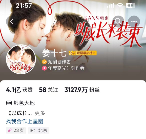 银色大地在微短剧市场的优势毋庸赘述。以“姜十七”为例,作为达人账号代表,她已经上线了14部微短剧,总播放量破58亿,单平台粉丝数突破3100万,有着“抖音微短剧一姐”之称。“浩杰来了”所发布的《慢慢喜欢你》《一生守候》等微短剧也纷纷斩获了近5亿的播放量。