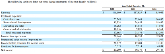 年报显示,2022年全年,Meta总收入1166.09亿美元,同比减少1.12%,净利润232亿美元,同比减少41.07%。