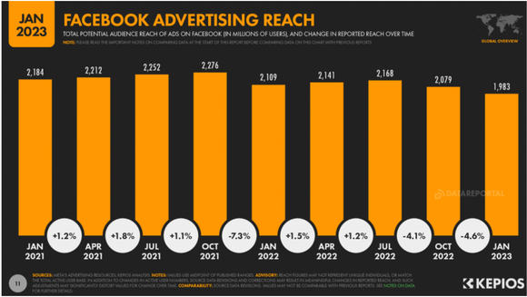 2023年1月,作为全球最大的社交平台,Meta通过Facebook可以触达全球约19.83亿人——虽然距2021年10月的最高值22.76亿人已经减少了12.87%。