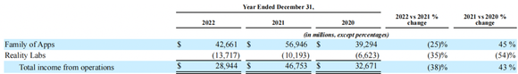2022年,对宏观经济下行的悲观预期导致广告主纷纷削减了营销支出,减少了对Meta旗下平台的广告投放。