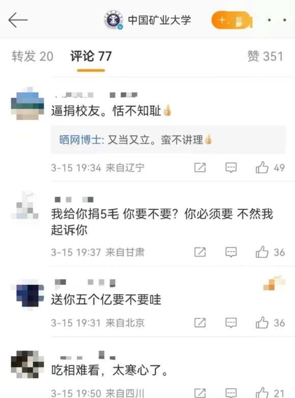 网友在矿大微博下面的评论(部分)。图 / 微博