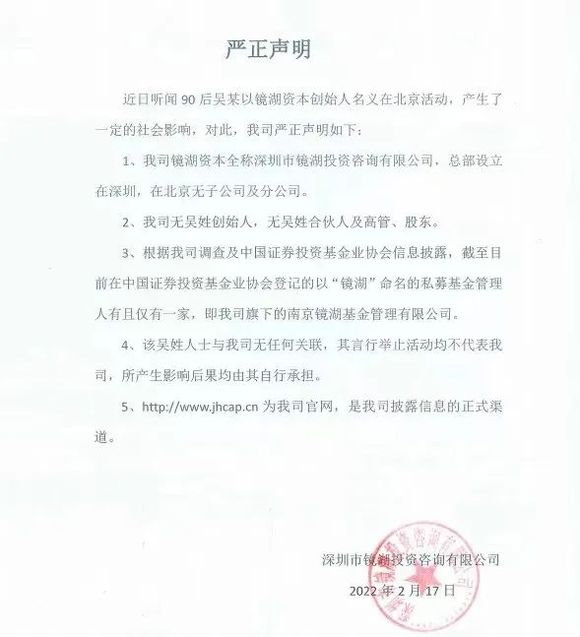镜湖资本的声明。图 / 镜湖资本