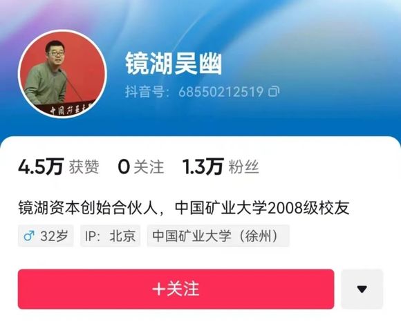 在吴幽的描述中,他后来又创业做淘宝电商,3年营收2.8亿;2014年,他认识了薛蛮子大佬,进入了创投圈,创立了“镜湖资本”,管理着一家“有46亿资金”的基金,而这个名字,就来源于母校矿大里的人工湖镜湖。