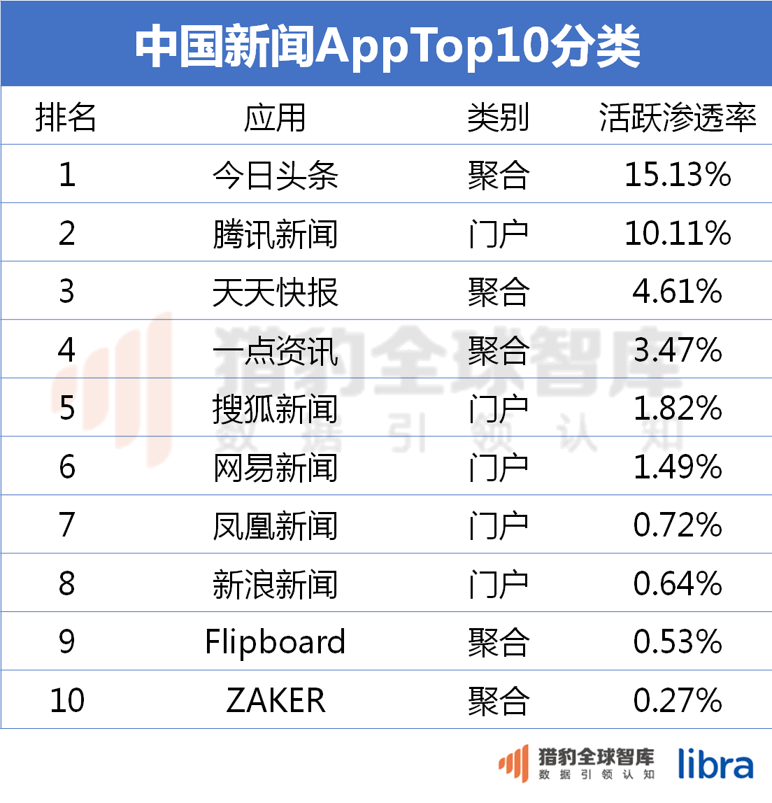 细数中国新闻资讯App Top10,其中门户类与聚合类各占5席,数量相当。从活跃渗透率维度观察,聚合类新闻App活跃渗透率整体高于门户类新闻App。腾讯新闻与今日头条作为各自类型的代表,活跃渗透率明显高于同类型其它App。