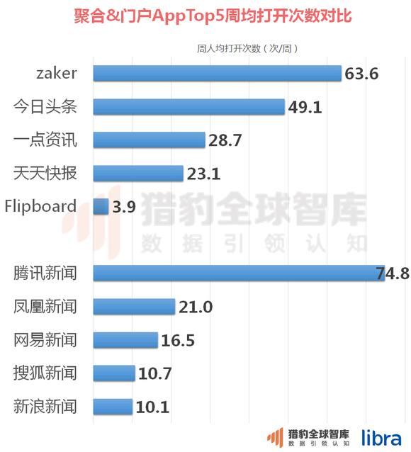 通过周均打开次数的对比发现,在中国聚合类新闻App周均打开次数更多,用户粘性更强。聚合类新闻App周均打开次数为33.68次/周,而门户类新闻App周均打开次数为26.62次/周。