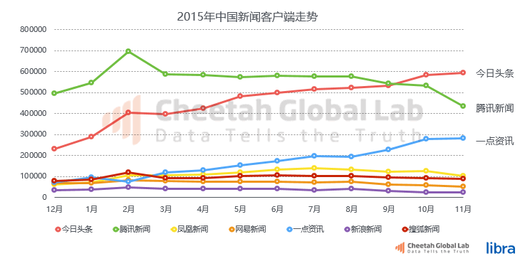 反观腾讯新闻的周活跃用户数,在一年中反而有所下降。同样的情况也发生在一点资讯上。2015年初,一点资讯还是与凤凰新闻、网易新闻、搜狐新闻、新浪新闻体量相当的新闻app,但到了2015年年末,活跃用户已经翻了三倍多,而其它门户几乎没有增长,有的还有下降。