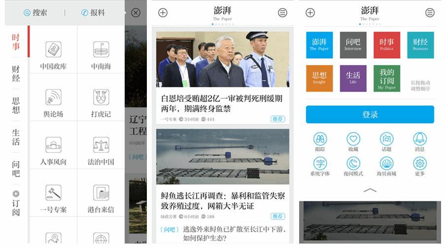 “澎湃新闻”是上海报业集团改革后的成果。专注时政与思想的媒体开放平台,口号是“专注时政与思想的互联网平台”。主打时政新闻与思想分析,致力于新闻追问功能与新闻跟踪功能的实践,在传统媒体的转型中算是比较成功的一个。