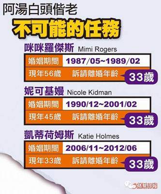 外国媒体曾发现一件很有趣的事,阿汤哥的三任妻子,在和他离婚时都是33岁。还有人把这称为魔咒。