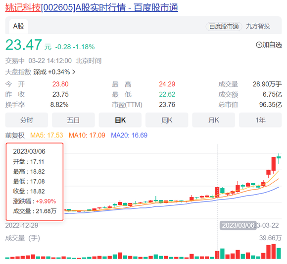 3月6日收盘,姚记科技股票涨停,有股友复盘发现,姚记当日涨停与生物医药板块有关。