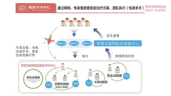 住院手术:患者在当地医院入住检查,专家可以通过互联网医院的线上查房中心,跟当地的医生一起完成日常的查房,并且远程指导当地的医生处理患者的病情,可以由专家团队定期派出医生,到当地为患者完成手术。