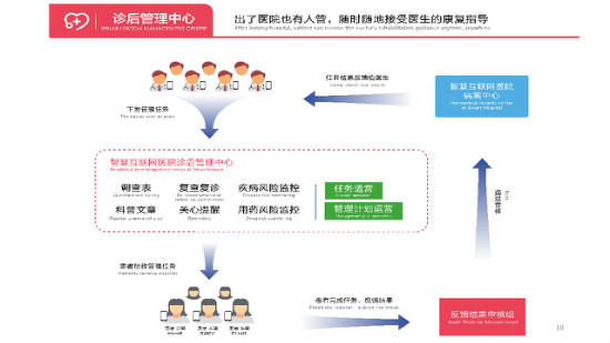 诊后管理:医生可以通过互联网医院的诊后管理中心,对患者下达各种各样的任务,患者在家里完成任务后上传。经过审核、汇总、复核后,这些资料会进入病案中心,并推送给相应的医生。根据患者提供的资料,医生再把新的医嘱放到任务中心,派给患者。