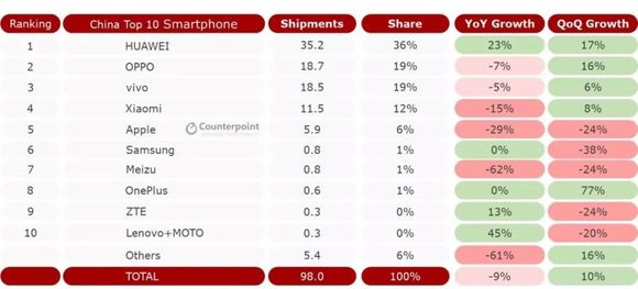 与之对比,苹果和华为势头正猛,都取得了不错的增长。