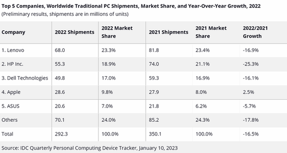 IDC数据显示,尽管联想依然是2022年全球PC出货量第一的品牌,但同比2021年却下滑了16.9%。