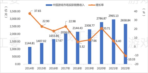《2022年中国游戏产业报告》显示,2022年中国游戏市场实际销售收入2658.84亿元,同比减少306.29亿元,下降10.33%;游戏用户规模6.64亿人,同比下降0.33%。其中,中国移动游戏市场同比下降14.40%;中国电竞游戏市场同比下降15.96%。