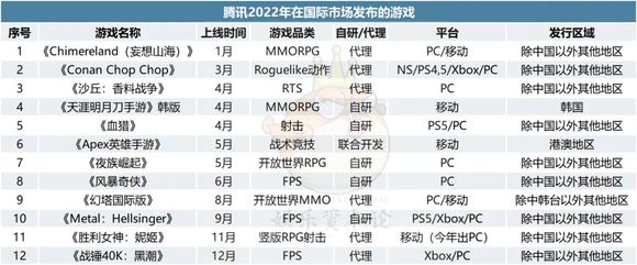 腾讯游戏在2021年12月8日正式公布国际业务品牌Level Infinite,并希望未来海外游戏收入与国内游戏收入达到五五开,也就意味着腾讯开始重点发力海外游戏市场,并将其视为与国内市场同等的战略高度。那么一年多过去了,腾讯在海外游戏市场的表现如何了呢?事实上,在整个2022年,腾讯游戏国际业务品牌Level Infinite发行了多达12款产品(如下表所示),在手游方面最值得关注的是《Apex 英雄手游》、《幻塔国际版》与《胜利女神:妮姬》。