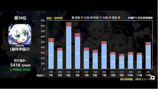在米哈游至今发行过的非买断制的游戏中,没有任何一款关停,最老的《崩坏学园2》已经上线9年,依旧在收割玩家的钱包,并且流水依然不低,在2022年有5416万营收。