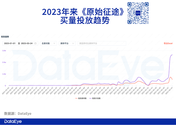 进入《原始征途》上线预热阶段,增加投放——3月24日当天,投放计划数(次数)、素材量都呈现飙升状态。