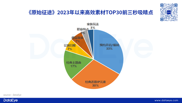 DataEye研究院梳理了《原始征途》2023年以来(截至3月23号),高效视频素材TOP30前三秒吸睛点。数据显示,“预约、福利”“经典还原IP”、“经典主题曲”占比较高,“装备”“职业”“玩法”也有一定比例。