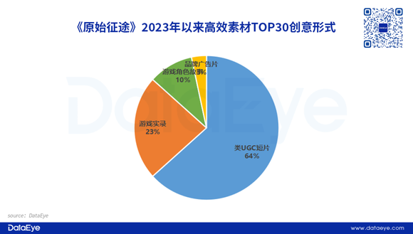 2023年来(截至3月23号)高效素材TOP30视频素材中,《原始征途》的高效素材主要以“类UGC短片”(类原生视频、实录+口播)为主要创意形式包装素材,占比接近2/3。而“游戏实录”占比为23%,排名第二。同时项目组也做了一些品牌广告和游戏角色故事,占比不高。