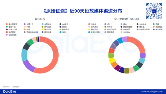 DataEye-ADX数据显示,(截至3月23号)《原始征途》投放媒体渠道TOP5分别为:穿山甲联盟、优量广告、今日头条、QQ音乐以及番茄小说。其中穿山甲联盟占比约为55%,位居第一。相比之下,短视频平台投放占比不高。