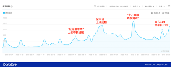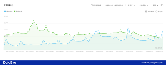 百度指数显示,2022年以来(截至23号),关键词“原始征途”搜索热度一直不低,一些时候甚至能超过贪玩已经上线的“原始传奇”关键词。且“原始征途”每隔2-3个月会有一次峰值。热度主要由于①游戏新动向②测试节点。