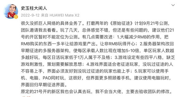 史玉柱代言:爱“画饼”、重公关、讲人话。2022年9月,史玉柱亲自下场参与《原始征途》的研发。由此开始了代言之路。史玉柱文风,讲人话、爱“画饼”、会自曝游戏缺点,还会公布建议。不要小看“讲人话”三个字,它试图传达的信息是: