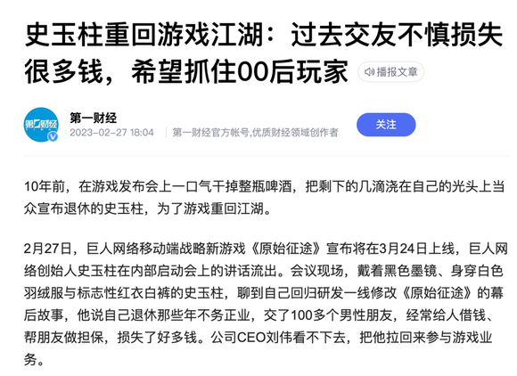 10年后,史玉柱重回游戏江湖,自曝自己退休时不务正业,经常给人借钱、帮朋友做担保,损失了好多钱。公司CEO刘伟看不下去,把他拉回来参与游戏业务。(第一财经报道)