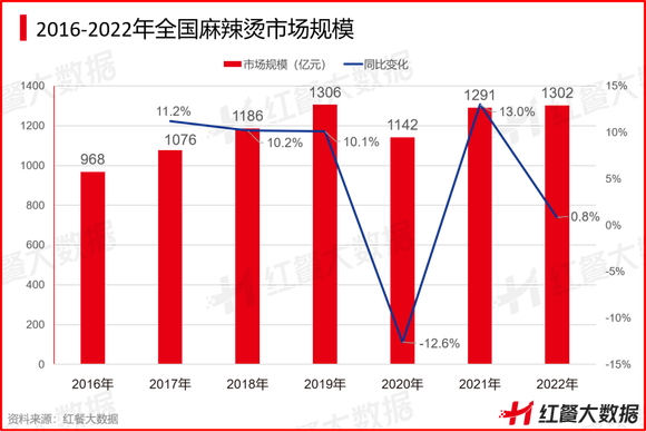 据红餐大数据,全国麻辣烫的市场规模由2016年的约968亿元,增加至2019年的约1306亿元。受疫情影响,2020年全国麻辣烫市场规模缩小至1142亿元,但2021年又反弹至1291亿元,同比增速为13.0%。