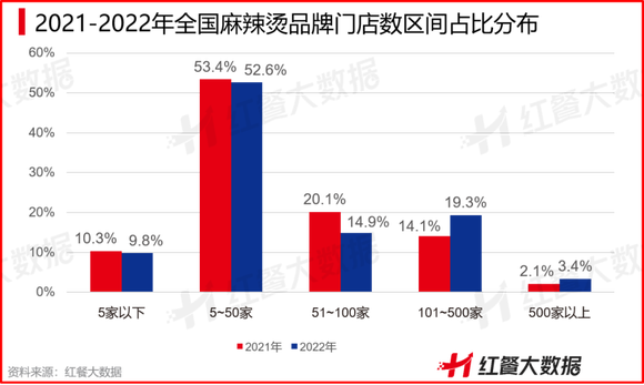 即便众多品牌门店数增长迅速,但总体来看,门店数超过500家的麻辣烫品牌依然寥寥无几。红餐大数据显示,2022年麻辣烫品类中,门店数在500家以上的品牌占比仅为3.4%。