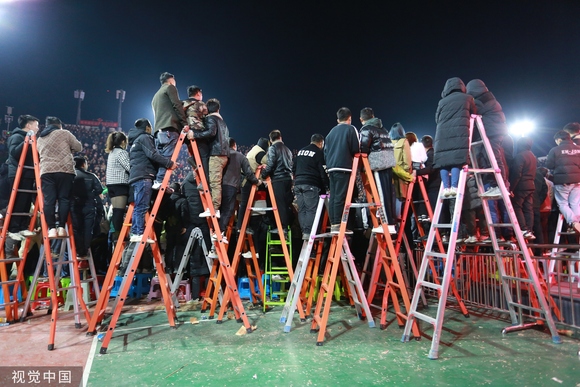 因为现场人太多,他和朋友没能挤进球场中央。除了球场里座无虚席以外,球场边还有许多人站在凳子、梯子上观看比赛,村民还在旁边做起了卖凳子的生意。