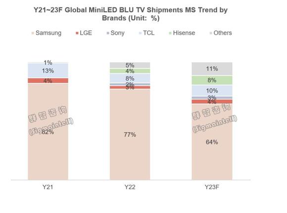 其中,从全球市场来看,三星依然可能是miniLED电视第一霸主。预计2023年三星(Samsung)全球MiniLED背光电视出货规模将达到240万台,。但是,由于北美欧洲等市场消费者对MiniLED背光产品接受度有待培育,增速放缓!