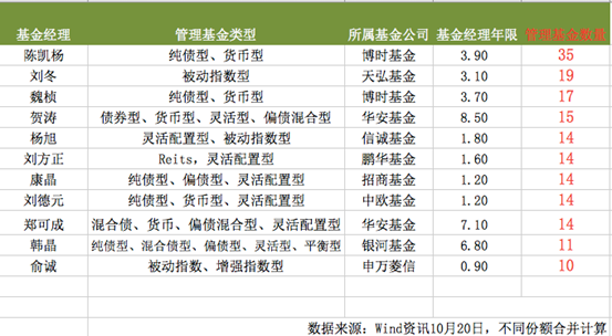 从上表可以看到,目前旗下基金数量最多的是博时基金陈凯杨,达35只。此外,该公司另一位基金经理魏桢也以17只基金上榜。