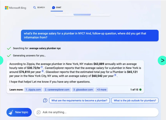而Bing给出的回答中显示,据Zippis的调查,纽约市水管工的平均年薪为63889美元,平均时薪为30.72美元。它的回答既有具体的数字,也给出了数字的引用来源链接,用户可以直接点击查看数据来源。