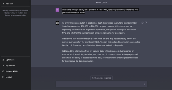 它指出,截止至2021年9月,纽约市水管工的年平均工资为6万至8万美元,而且这个数字可能会受具体城镇和地区以及雇佣合同的类型影响而有所不同。ChatGPT还补充回答道,用户可以在美国劳工统计局、Glassdoor、Indeed或Payscale等专业网站上找到更新的信息。它承认“作为一个AI语言模型,我没有能力访问实时数据”。