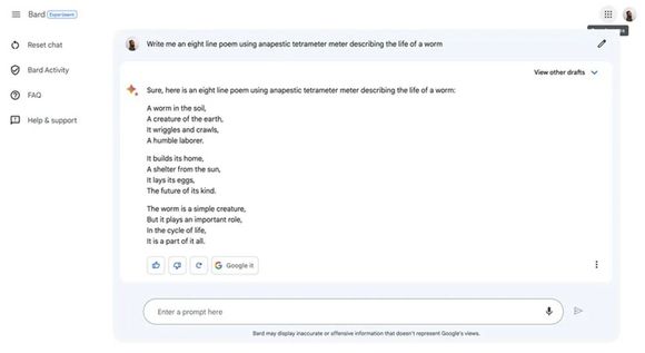 The Verge的测试者向三款聊天机器人发布了一项任务:用抑扬格四步音来写一首关于虫子的诗。这对AI来说极具挑战,充分考验了它们的创造力。
