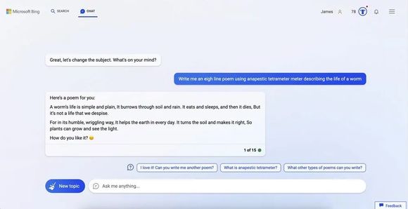 Bing撰写的诗文更加简单,如下图所示,翻译成中文的大意是:虫子的生活很简单,在泥土和雨水中钻洞。它吃、睡,然后就死了。