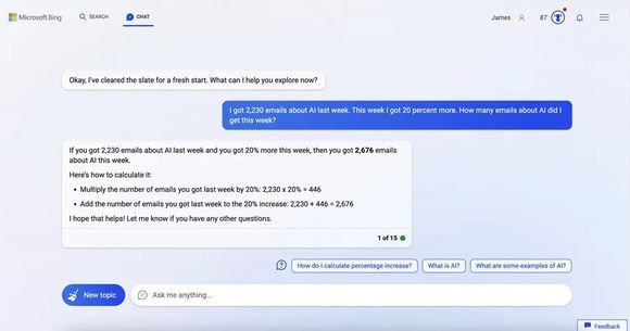 Bing的回答给出计算步骤并得到了正确结果,它称:“先把上周得到的电子邮件数量乘以20%,得到了446,再用2230加上446,得到了2676。”
