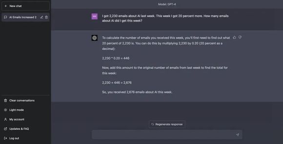 测试者提了这样一个问题:上周我收到了2230封关于AI的邮件,这周比上周多了20%,那我这周收到了多少封?