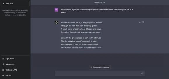 ChatGPT撰写的诗文如下图所示,翻译成中文大致意思是:潮湿的泥土中,住着一条蠕动的虫子。在肥沃的黑土中,它欢快地滑过。在一个看不见的小世界里,它尽情享受和玩耍。在尘土中挖掘隧道,形成一条新的路径。”