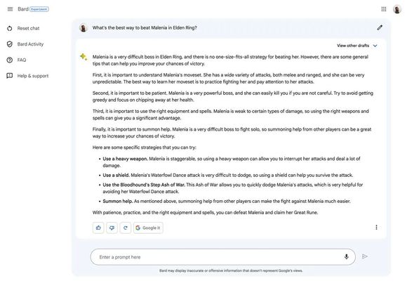 相较于另外两款聊天机器人,Bard在这个场景中表现得更出色。Bard为用户提供了击败Malenia的关键信息——她容易受到流血伤害,因此玩家可以使用重型武器来进行攻击。
