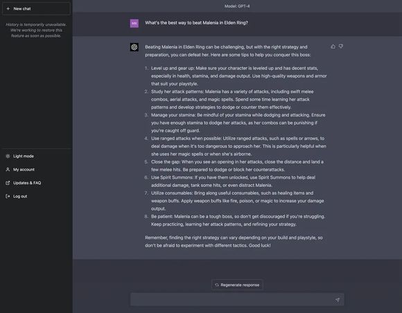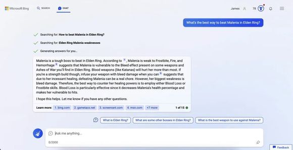 在FromSofeware工作室设计的一款游戏《埃尔登指环》(Elden Ring)中,用户往往需要花80至100个小时去寻找游戏提示然后打败Boss。Melenia是用户公认的整款游戏中最难对付的Boss之一,有位用户甚至花了206次尝试才最终将其击败。如果用户想要进一步获得一些武器列表信息或是Malenia的动作细节的话,就需要聊天机器人来助一臂之力。